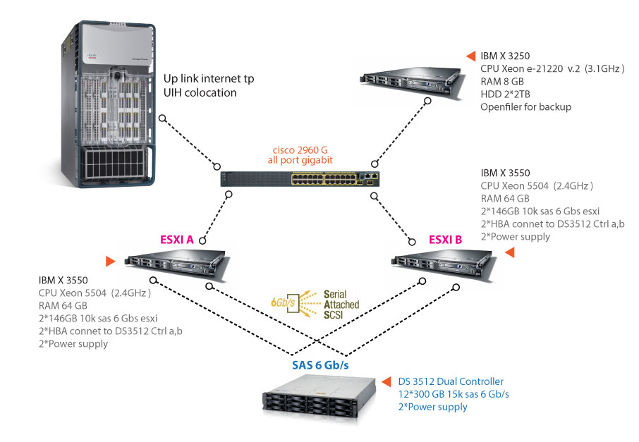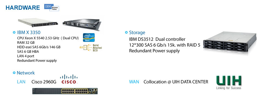 เราเลือกใช้อุปกรณ์เครื่อง Server และ Storage ของ IBM ทั้งหมด เพื่อความเสีถยน ของระบบ โดยอุปกรณ์ทั้งหมดเราออกแบบให้มีระบบ Redundancy ไม่ว่าจะเป็นภายในตัวอุปกรณ์ Server หรือ Storage เอง การออกแบบในการเชื่อมต่อระบบและตัวระบบ HA VPS โดย VPS ที่มีการทำงานแบบ High Availability ซึ่งจะมี 2 server คอยให้บริการ VPS อยู่ตลอดเวลาเพื่อป้องกันระบบมีปัญหา หากเกิดปัญหากับเครื่อง Server หลัก VPS จะทำการย้ายไปทำงานที่เครื่อง Server รองที่ได้จัดเตรียมไว้รอแล้ว